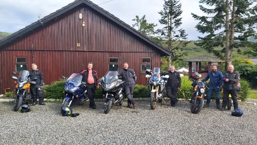 Cast and bikes left to right at Fort William: Jamie Wells with his cracking little Honda CB500X, Simon Steer, Backline RM with his mighty but flawed Yamaha FJR1300, Andy Callan (Backline Trainer) with his beautifully engineered BMW RT, Marc Wells and the awesome Honda Africa Twin 1100, Kev Burt, and his beloved Kawasaki Vulcan S 600, and finally, Pete Williams and his totally underestimated and beeeeeautiful yellow ‘T’ reg VFR800 F1).